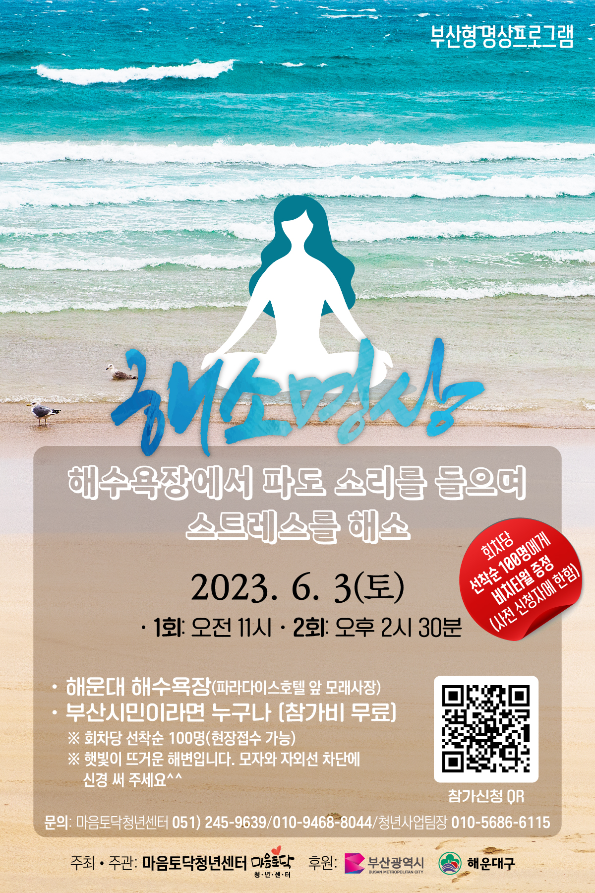 1. 일 시: 2023. 6. 3.(토) 11:00/14:30, 2회 2. 장 소: 해운대해수욕장 (파라다이스 호텔 앞 백사장) 3. 참여대상: 청년 및 부산시민 200여명 (회당 100명) 4. 주요내용: 힐링요가, 소리명상을 통한 심신치유 5. 주최/주관: 마음토닥청년센터 6. 후 원: 부산광역시, 해운대구 7. 신청방법: 온라인 접수(당일 현장접수 가능) -포스터 QR코드 스캔 -링크접속 https://forms.gle/SYHDht6tck8Pxwpk6