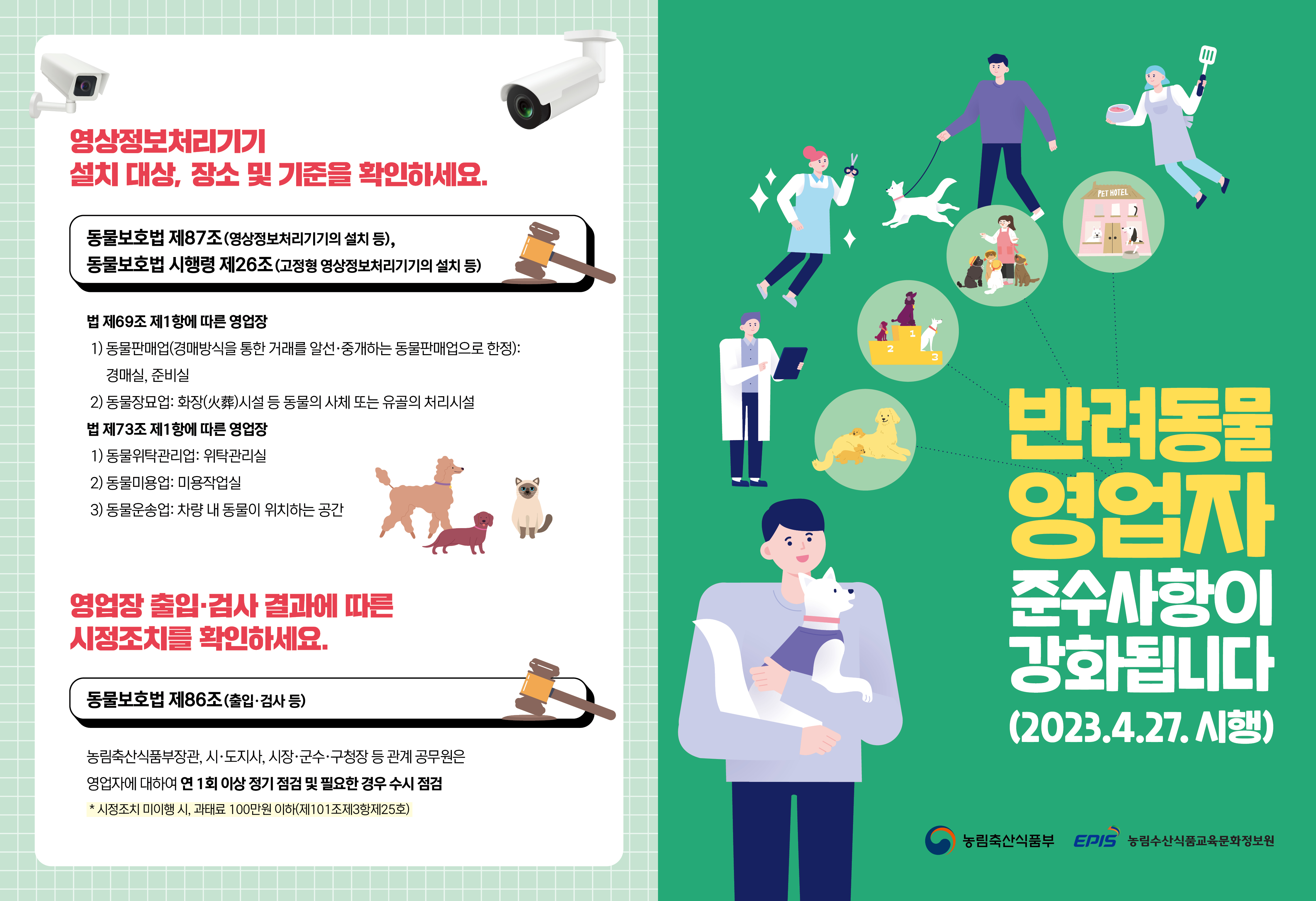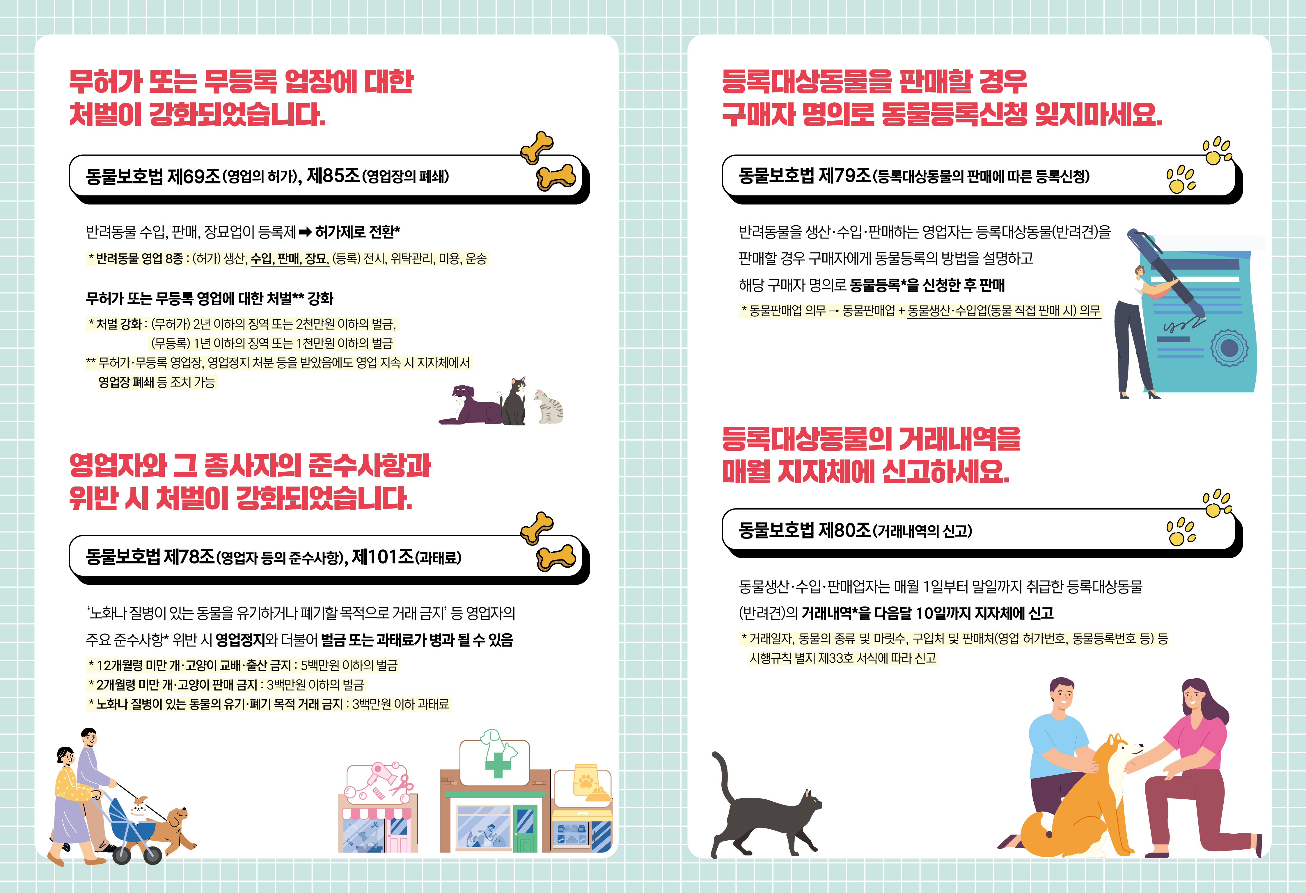 [동물보호법 개정](영업자 준수사항)2023년4월27일부터 이렇게 달라졌습니다 공지사항 게시물 상세 정보 작성자 일자리경제과 작성일 2023.06.06 첨부파일 반려동물영업자준수사항강화리플렛.pdf (2012 kb)바로보기내려받기영업자준수사항리플렛1.jpg (2694 kb)바로보기내려받기영업자준수사항리플렛2.jpg (3335 kb)바로보기내려받기