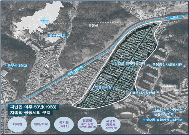 반여에 쉼표와 느낌표를 더하다. 마을에 정주여건 개선을 위한 비워내기와 마을활력을 위한 더하기, 주민 스스로 자립할 수 있는, 주민 전체가 화합할 수 있는 마을로의 전환 |