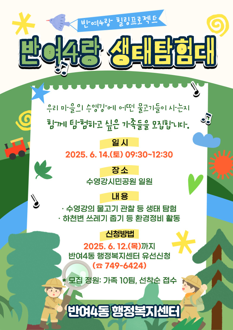 2025년 지역자원 연계 특화프로그램의 일환으로 「반여4랑 생태탐험대」를 운영합니다. 수영강에는 어떤 물고기들이 사는지 관심있는 가족들의 많은 신청 부탁드립니다 <반여4랑 생태탐험대> ○ 운영일시: 2025. 6. 14.(토) 09:30~12:30 ○ 운영장소: 수영강시민공원 일원 ○ 운영내용: 가족과 함께 수영강에 서식하는 동·식물 등 생태자원 탐험 ○ 참 가 비: 무료 ○ 모집대상: 생태탐험에 관심있는 가족 10팀 (최대 30명) ○ 모집방법: 2025. 6. 12.(목)까지 선착순 접수 (유선신청 749-6424)